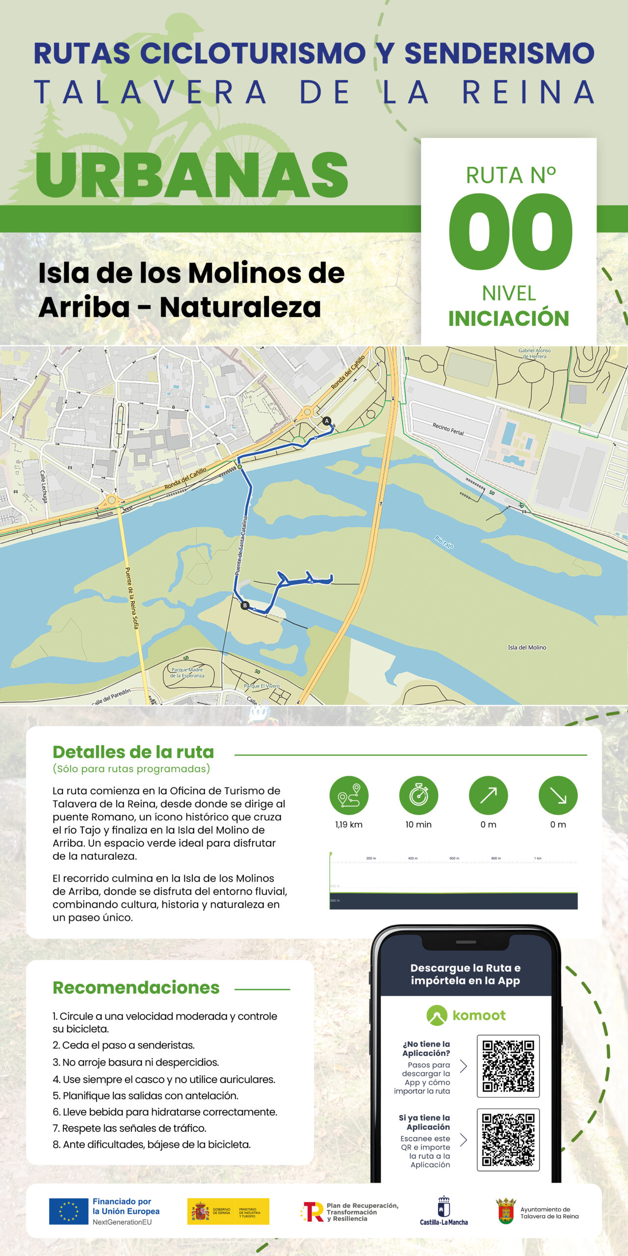 La ruta comienza en la Oficina de Turismo de Talavera de la Reina, desde donde se dirige al puente Romano, un ícono histórico que cruza el río Tajo y finaliza en la Isla del Molino de Arriba. Un espacio verde ideal para disfrutar de la naturaleza.