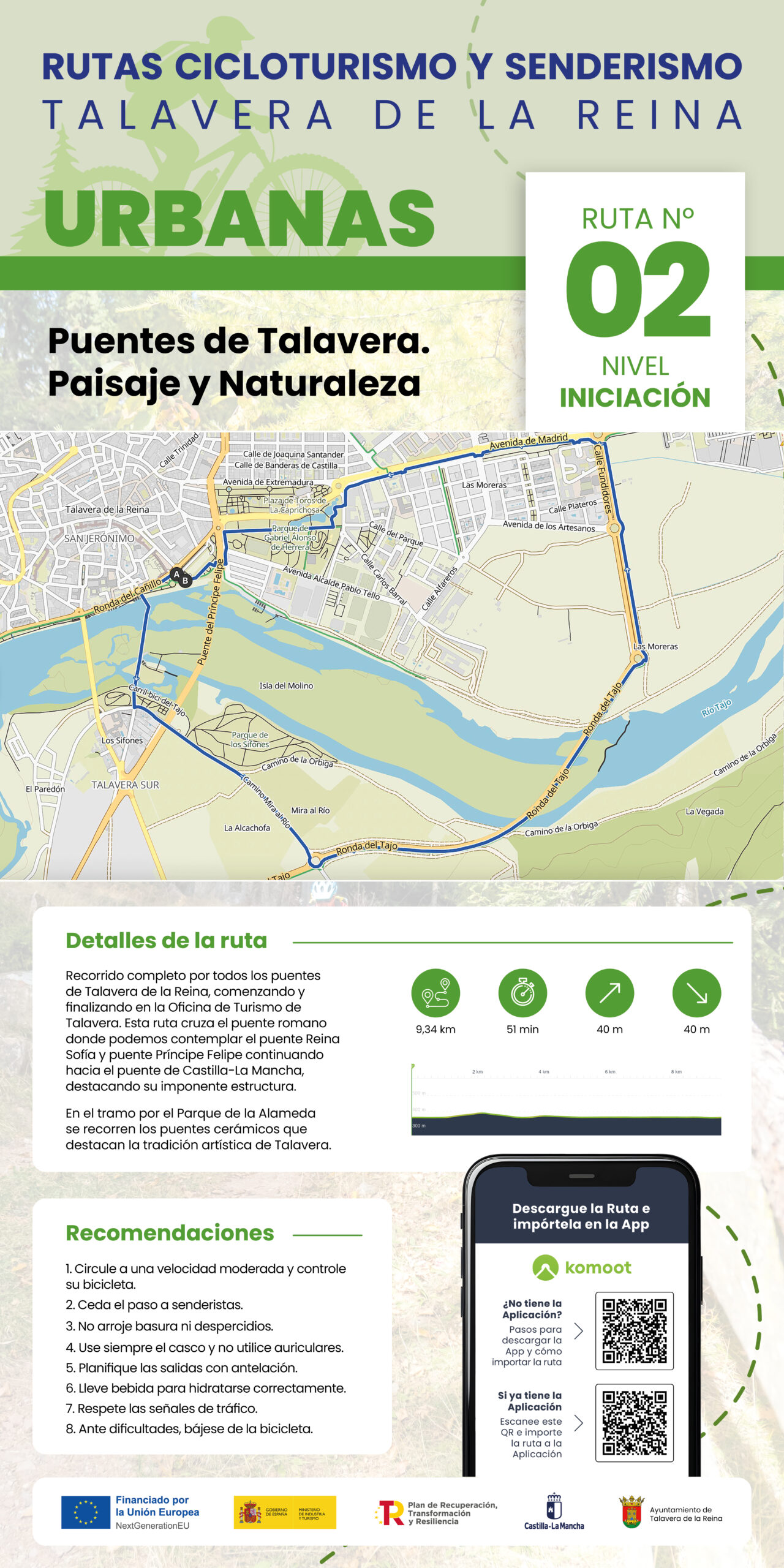 Recorrido completo por todos los puentes de Talavera de la Reina, comenzando y finalizando en la Oficina de Turismo de Talavera. Esta ruta cruza el puente romano donde podemos contemplar el puente Reina Sofía y puente Príncipe Felipe continuando hacia el puente de Castilla-La Mancha, destacando su imponente estructura.