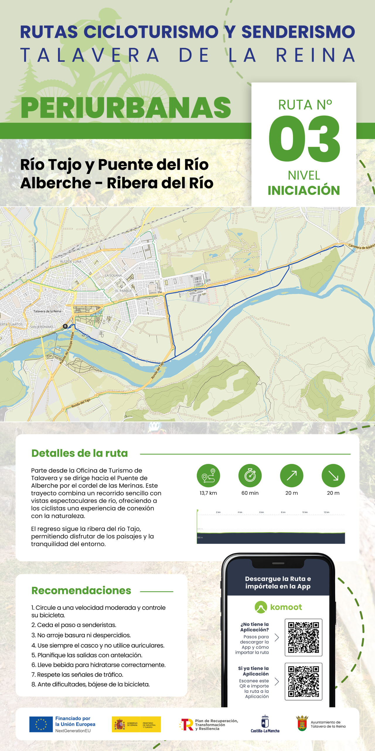 Parte desde la Oficina de Turismo de Talavera y se dirige hacia el Puente de Alberche por el cordel de las Merinas. Este trayecto combina un recorrido sencillo con vistas espectaculares de río, ofreciendo a los ciclistas una experiencia de conexión con la naturaleza.