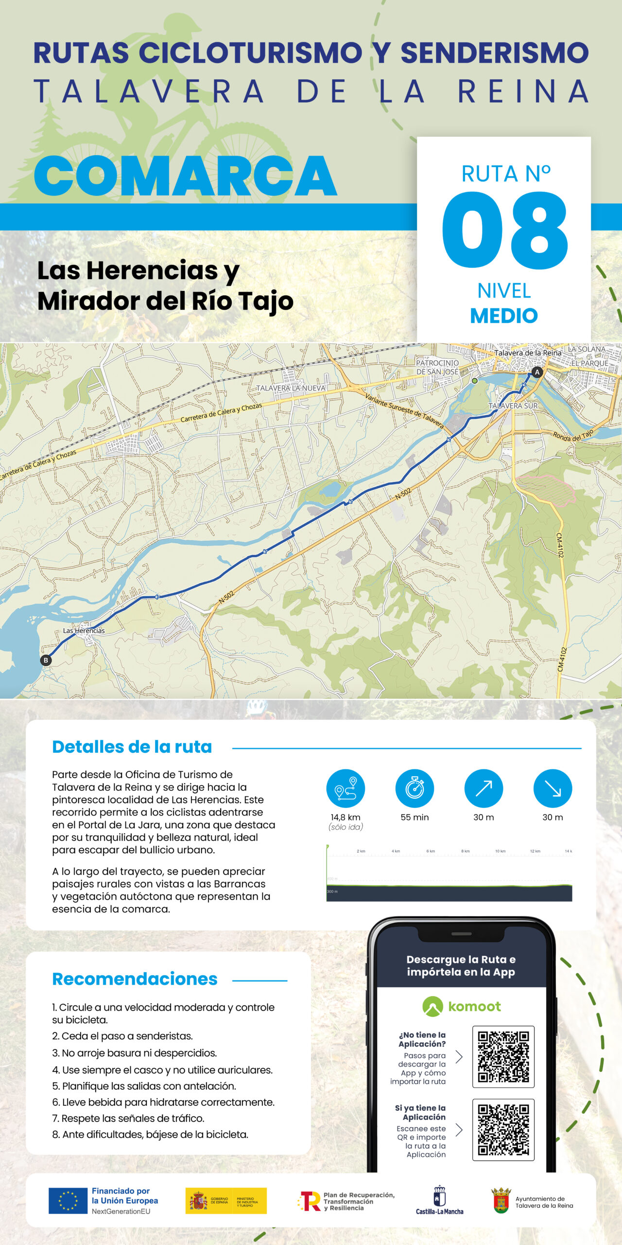 Parte desde la Oficina de Turismo de Talavera de la Reina y se dirige hacia la pintoresca localidad de Las Herencias. Este recorrido permite a los ciclistas adentrarse en el Portal de la Jara, una zona que destaca por su tranquilidad y belleza natural, ideal para escapar del bullicio urbano.