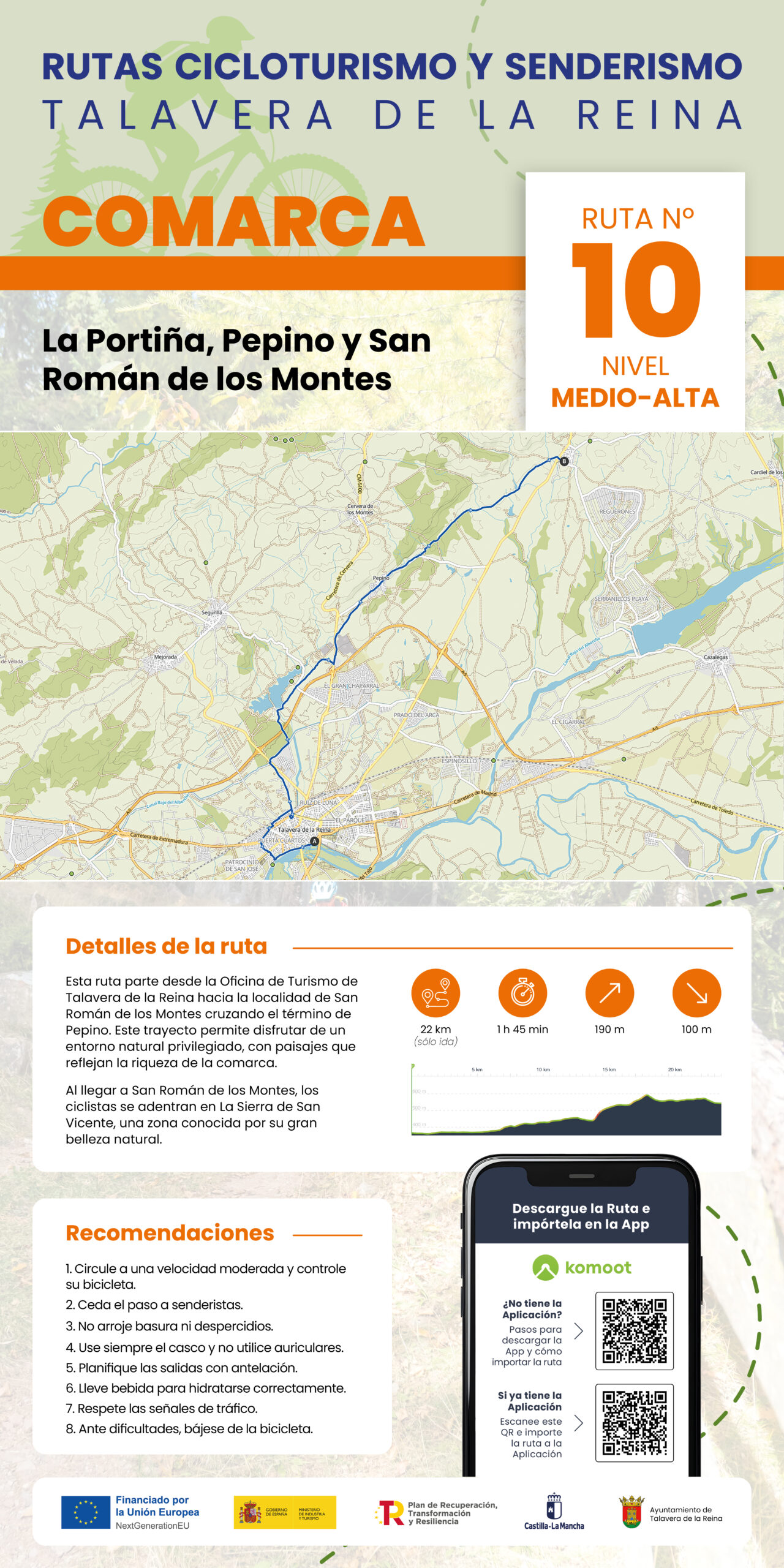 Esta ruta parte desde la Oficina de Turismo de Talavera de la Reina hacia la localidad de San Román de los Montes cruzando el término de Pepino. Este trayecto permite disfrutar de un entorno natural privilegiado, con paisajes que reflejan la riqueza de la comarca.